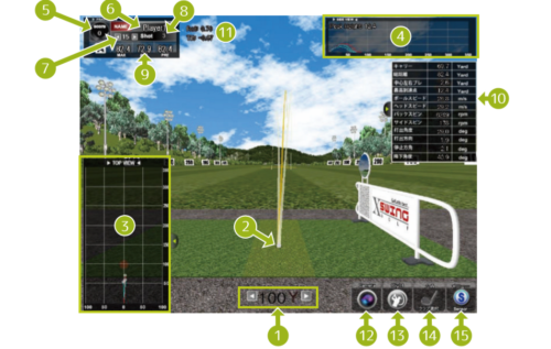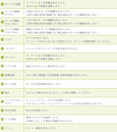 飛距離・方向はもちろん、ボールの打ち出し角度や回転数、回転軸、スピードなども測定出来ます。